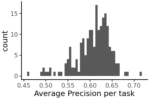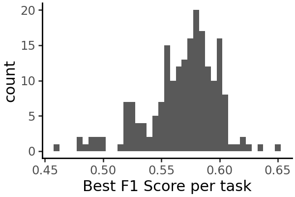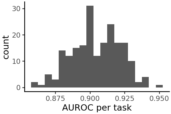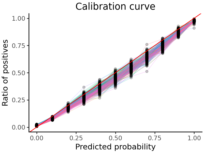 We can plot a calibration curve for all the tasks. This shows us the fraction of true positive examples, for different levels of model-predicted probability.