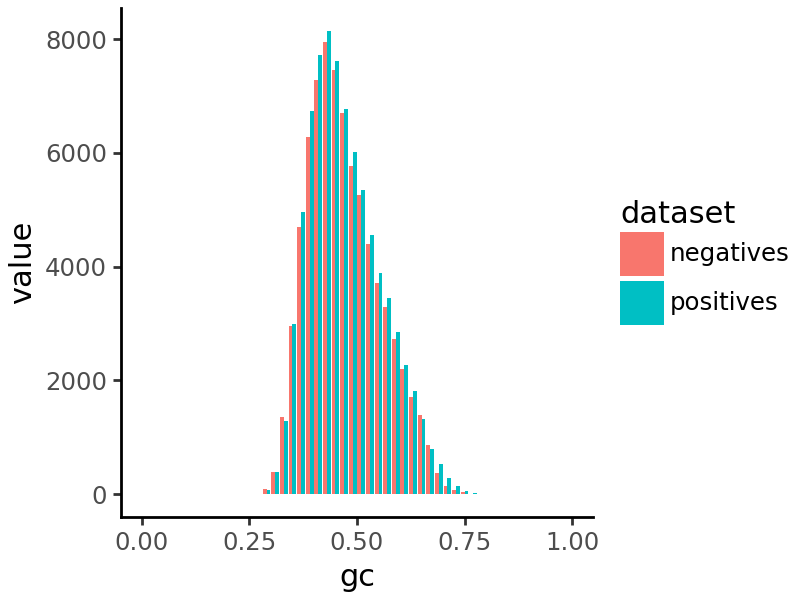 We can visualize a histogram of GC content in the peaks and negative regions to verify that they are similar.