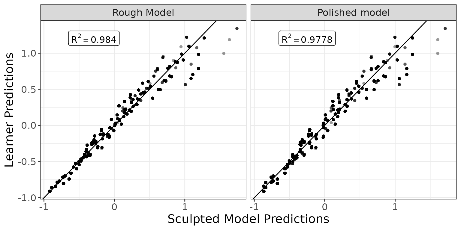 Let’s compare the predictions of the original model vs sculpted models (\(R^2 = 1\) would mean exact match to the xgboost predictions).